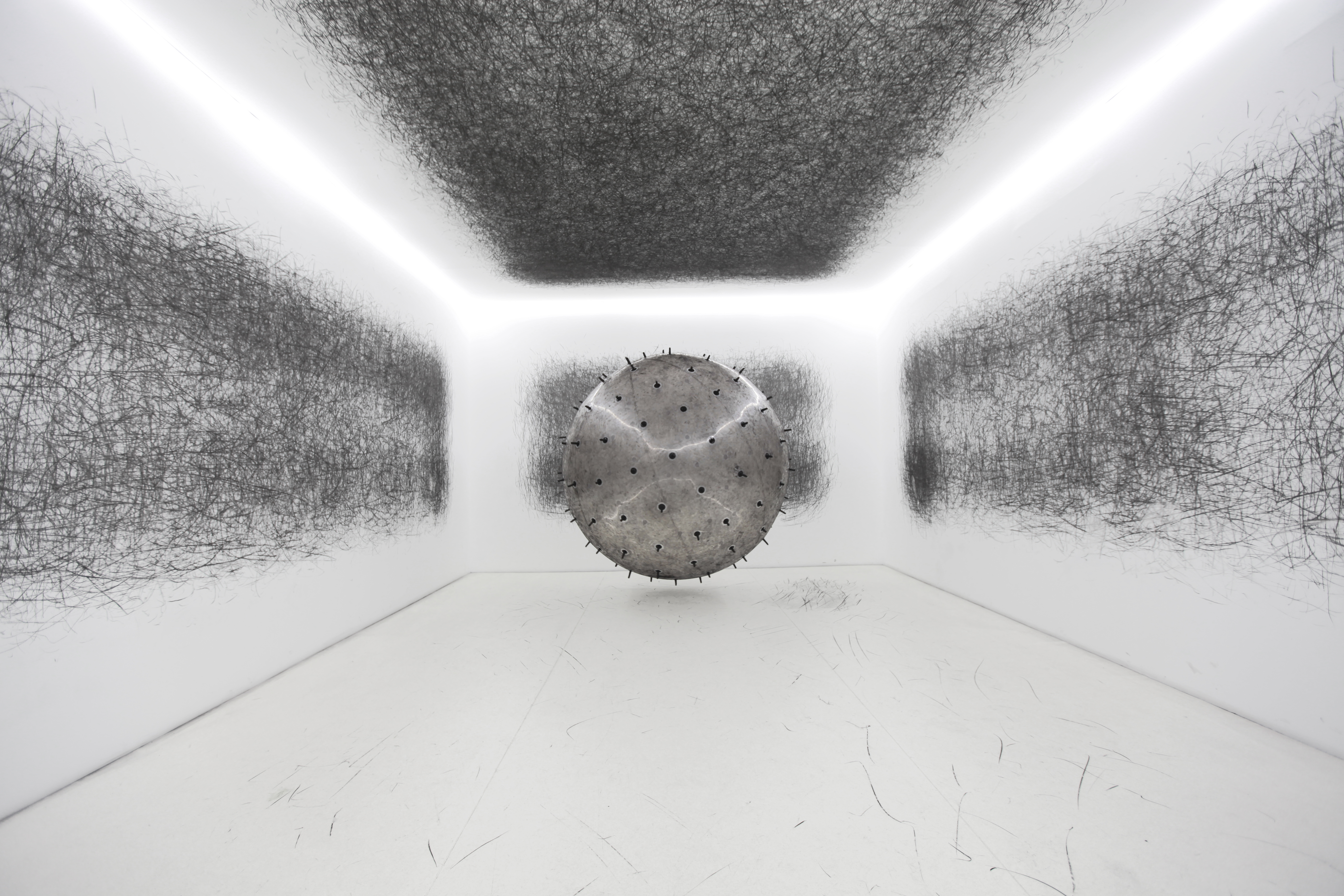 analog interactive installation / kinetic sculpture / post-digital drawing machinecomponents > PVC balloon, charcoals, helium, air