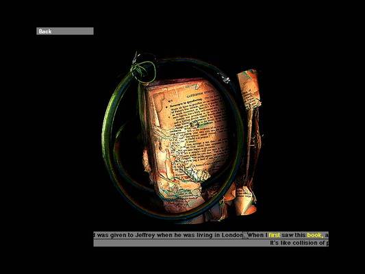 Die Sprache der Dinge is an archive of personal memorabilia presented on a conveyor belt-like 'shelf' on the black monitor screen, and able to be arranged according to numerous objective criteria. Associative spoken texts accompany each object, hyperlinks within these texts lead to chance encounters between the objects and the narratives.