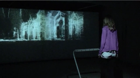 Exploded Views is an interactive installation whereby three participants run on individual conveyor belts. They physically move themselves through both an interactive audio-environment and interactive imagery projected at the front of the belts. The action of the observer’s body is the determining factor for setting the 3D images into motion. This physical effort made by the viewer in turn reveals several cityscapes from all over the world.