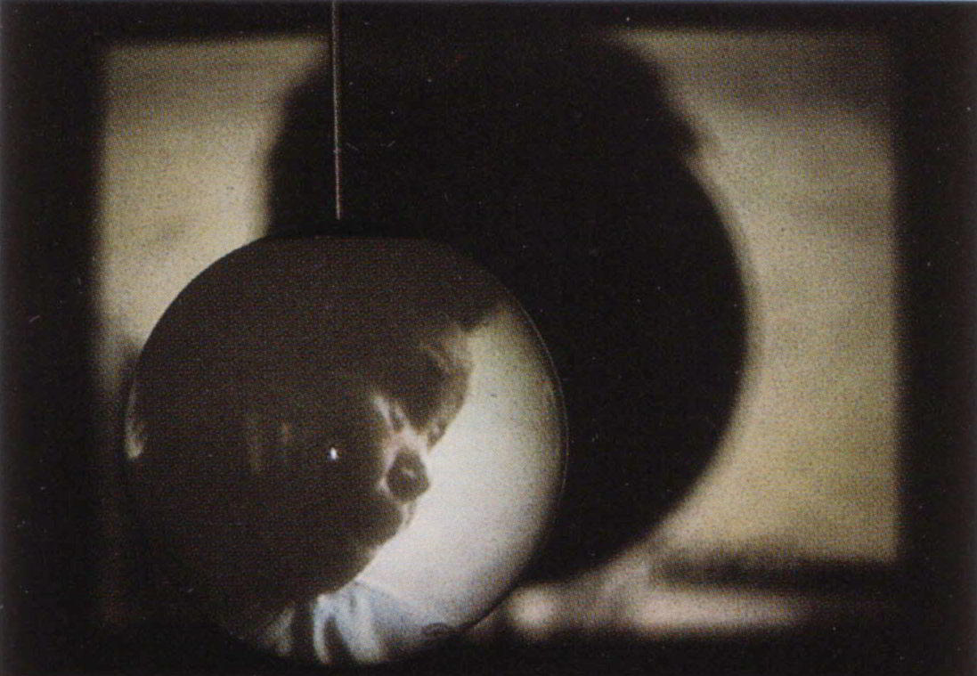 "The projection of a sequence of images onto a ball and, as a consequence, the wall behind it, results in the juxtaposition of two projection surfaces. Whereas the ball displays a focused but distorted image, the wall surface displays a fragmented, diffused one.