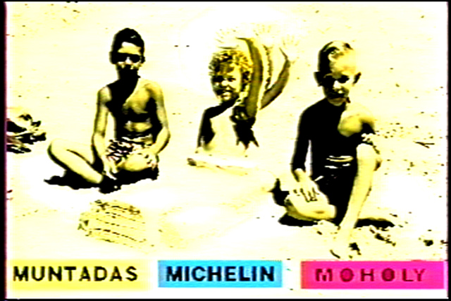 Designed as a large scale video projection (3:12 minutes), like a sonorous moving billboard. It shows 3 times almost the same sequence of images, each time with a different audio. An old photography depicts the image of three children at the beach. A girl between two boys waves her hand. It is not obvious that she is a girl. The images are associated with the frase The Interval between Things and the names Muntadas, Michelin and Moholy.