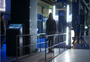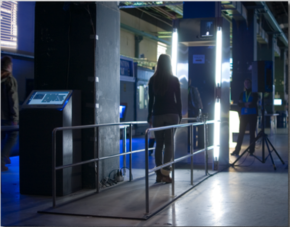 A barrier guides visitors towards the brightly lit entrance where a mounted camera records and projects each individual’s image on a LCD monitor at the back of the gate. Two speakers on stands, located directly after the gate, symbolise (act as) security guards.