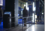 A barrier guides visitors towards the brightly lit entrance where a mounted camera records and projects each individual’s image on a LCD monitor at the back of the gate. Two speakers on stands, located directly after the gate, symbolise (act as) security guards.