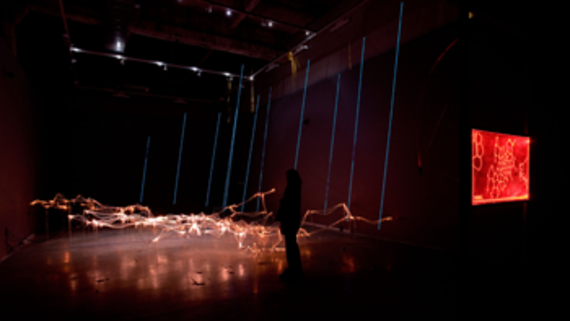 Mark-David Hosale: Quasar, 19-12-2019, in: Archive of Digital Art Quasar is an immersive light and sound space made from prototype membranes and realized as an interactive light/sound object and comprised of a dense array of interlinked elements describing an intricate three-dimensional structure. The gallery is fitted with sensors that draw real-time data from the installation and the people within the exhibition, which is then synchronized with streamed real-time data of solar activity and nuclear processes provided by SLAC and NASA. This information is then fed back into the object through layers of LED strands, re-visualizing the space in order to create an interactive spatial experience.