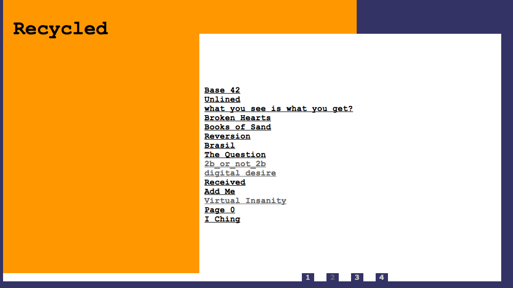 Archive of Digital Art (ADA). “Giselle Beiguelman - »Recycled«”. https://www.digitalartarchive.at/database/general/work/recycled.html (retrieved 2009-26-09).