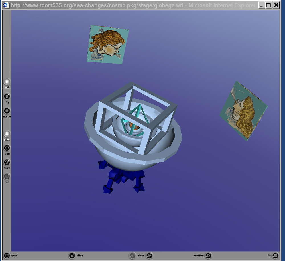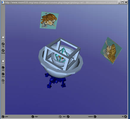 In Sea-Changes (1997-98) artists age 50 or over, from a variety of disciplines, were invited to submit personal biographical materials to a common database. The original idea was to have them use that database as a basis from which create fictional biographies. Although many artists registered to participate, it turned out to be more difficult than anticipated to get people in this age group to see the project through to the end, particularly because this was still an early period of internet use. As there was some very good writing among the submissions, I by-pased the second stage of the project and posted the original biographical submissions. Visitors to the site can access the biographies and supporting materials by means of an image and text-based title page or by means of a 3-D VRML application--the VRML was designed to emphasize the idea in the original conception that the site held a multi-dimensional universe.