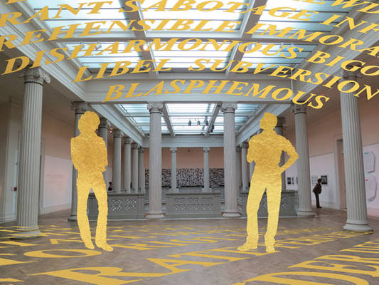 In these "pavilions of absence," images of contemporary artists whose works have been censored are reduced to gold silhouettes and placed in the midst of terms of transgression. Each erased silhouette stands for countless unknown or lesser known artists who face censorship or persecution with no public support.