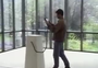 This work is constituted by a white pedestal on which there stands an LCD colour monitor connected to computing machinery by a cable running through the pedestal. The viewer of this work picks up and holds this monitor in his hands. The screen shows a representation of the pedestal with a computer-generated image of a golden calf on top. By moving the monitor around the actual pedestal the viewer can examine this golden calf from above and below and all sides. Thus the monitor functions like a window that reveals a virtual body apparently located physically in the real space. The golden calf has a shiny mirror-like surface in which the viewer sees reflections of the actual venue of the installation. These are previously digitised photographs of the room that are 'reflection-mapped' onto the calf's skin. While the viewer himself is not included in this digitised reflection of the environment, he does see himself refelected on the glass surface of the LCD screen.The immateriality of this golden calf is further emphasised by the fact that only its outer surfaces are modelled, so that if the viewer moves the monitor screen into the calf's body none of its interior surfaces are visible. In The Golden Calf the body is no longer a corporeal object but instead the immaterial subject of a specifically physical process of disclosure. When moving the monitor screen up, down and round the pedestal, the viewer performs what looks like a ceremonial dance around a technological pilaster construing an almost tangible phantasm.