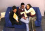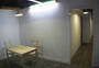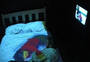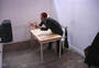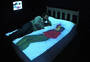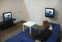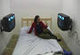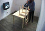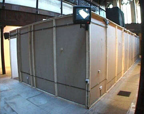 This installation entitled There's no simulation like home is the culmination of artistic telematic research since 1992. The exterior of the installation resembles the back of a plasterboard stage set, or as if the bricks of a house had been removed to reveal the back of the inner plasterboard skin. Electricity and video cables are traced and attached all around the surface of the structure, looking like the back of large circuit board. The installation is architectured on the ubiquitous form of the English terraced house. Using a walk through narrative sequence, from front door to back door, the audience encounter differing telepresent interfaces in each of the four rooms: the living room sofa, the bedroom, the dining room table and the bathroom mirror. Before entering the installation the audience have the possibility to view the installation through a series of peepholes positioned along the plasterboard exterior Inside the installation the audience are encompassed within a simulated domestic home environment, exemplified in the dimensions of the rooms, the wood-chip wallpaper, the light fittings, skirting board and wall sockets. The living room sofa and television screen form the first telematic link outside the installation space, where a second sofa and video monitor are located. By using a system of live chroma-keying the two separate people, who could be any distance apart, share the same sofa on the same telepresent screen. In the bedroom the viewer can lie down on a bed onto which a live video projection is being made of another person, who is located outside the installation space on a second bed. A video image of the combined audiences together on the projection bed allow the viewers to interact in a telepresent space by touching with their eyes. The exterior installation space communicates a contrasting image to the domestic interior. Unlike the inside, the technology is very visible - akin to a media lab environment. The telepresent interfaces located on the outside of the installation, appear as areas for interaction and observation of the experiment like situation taking place inside the installation. In keeping with the techno reference of the exterior installation, video images from small surveillance cameras inside are constantly being displayed on monitors outside. The dining room table is the third telematic interface to the outside installation. Offering a slightly less psychological complex platform for interaction. Working with a system of live chroma keying between two separate tables the remote viewers are able to sit at the same table in the same telepresent room. The final room and interface the audience confront before exiting out the back door, is the bathroom mirror. What initially appears to be a normal mirror, lacks one essential truth - the viewers own image. A momentary illusion that is broken only when the viewer realises the mirror is in fact a window into an identical room. Whilst we have become accustomed to accept the existence of ourselves in telepresent forms throughout this installation. we are finally denied the most simple telepresent truth we expect from a mirror, putting the notion of the real and the virtual into question. By representing the domestic reality inside the installation as a fabrication of the technological apparatus outside. There's no simulation like home attempts to present realities as a construct of language. This installation serves as a contextual wrapping for the telematic research and developments used within it. Paul Sermon