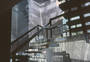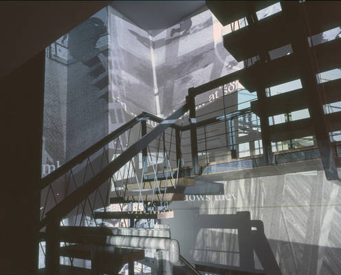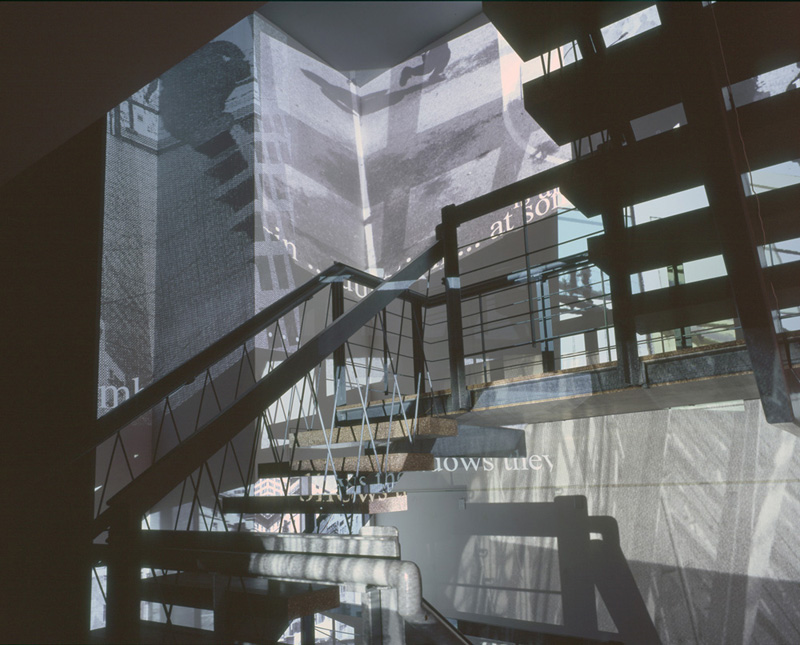 Trigger explored the vignettes, ebbs, flows and narratives that emerge from the relationships we have with urban spaces. It featured seven projections that were configured to fill the stairwell space. Visitors passed through a set of 12 motion sensors changing, black-and-white cityscapes to images enlivened by splashes of color and sound. The piece evoked the transient nature of urban space, and our equally fleeting and shifting perceptions of it.