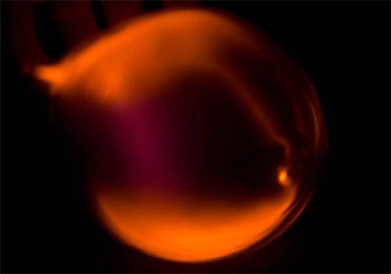 warden sprites raum3, 2009-2010 Series of photos, an elf-receiver, 1 Mac mini with net-access, 1 ISOPHONE PLS 320 / 400, 1 radial high tone beamer with control unit developed by N-solab, 1 UV 350nm Spot with control unit developed by N-solab, fluorescent molecules Courtesy: Jan-Peter E.R. Sonntag & N-solab The artist transforms atmospheric plasma live stream data into modulated air and electromagnetic UV-waves which flash as visible low-frequency red sprites under the ceiling of the black perception space. In the installation a standing pressure sinus wave is structuring the invisible Euclidian architecture with an amorphous field. A computer-system in the exhibition will dive through the aether space formed by Extremely Low Frequency (ELF)-data-streams. The received natural ELF-waves are pitched into the ultraviolet part of the electromagnetic spectrum. Through a specially developed tweeter beam the high tone sound wave is projected to the ceiling inside the black cube where it reflects as sound figures and low red electromagnetic waves (as “whistlers” and “cracklers”), sferics and red luminous flashes.