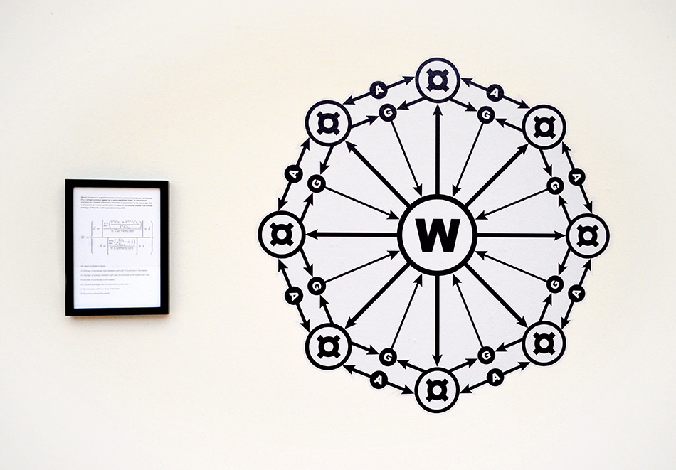 "This artwork illustrates a global currency through the creative formulation of an equation and a trading algorithm for the currency exchange market. The visionary creation of algorithmic trading combines art with the material that governs contemporary society. In doing so, it aims to introduce new art practices.